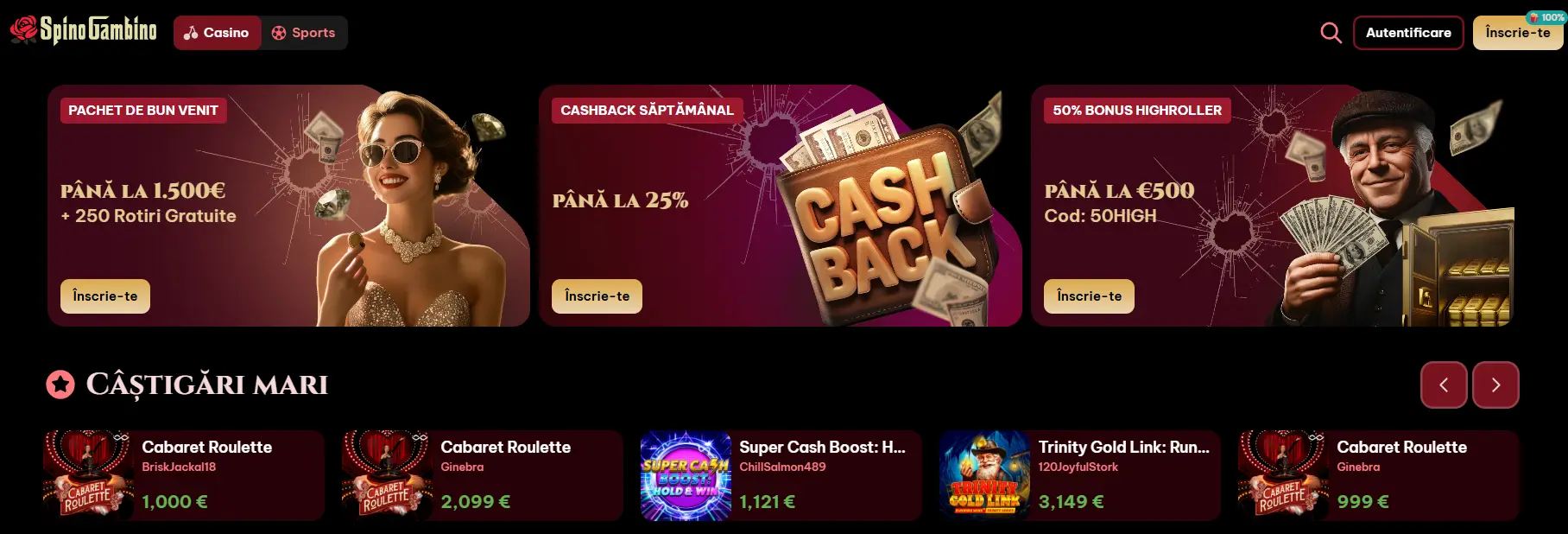 SpinoGambino pariuri, pune la dispoziție 7 promoții printre care ai cashback din pierderi, premi zilnice, cash out, iar pe lângă acestea ai parte de un pachet bonus de bun venit dispus pe primele 3 depuneri.