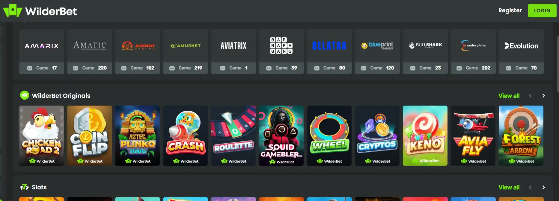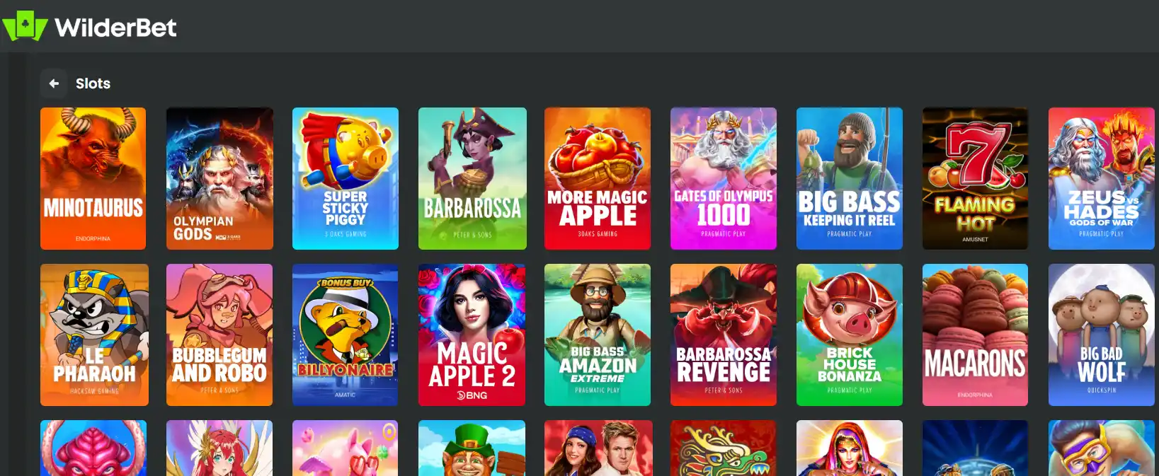 Deși sunt și câțiva furnizori a căror contribuție la WilderBet Casino constă în jocuri: instant/crash, table games, ori live games cu tot ceea ce presupun ele respectiv: studio, dealeri soft, etc; majoritate producătorilor furnizează păcănele într-un procent mai mare sau doar păcănele, asfel spus la WilderBet Casino sloturile conduc în topul procentual.